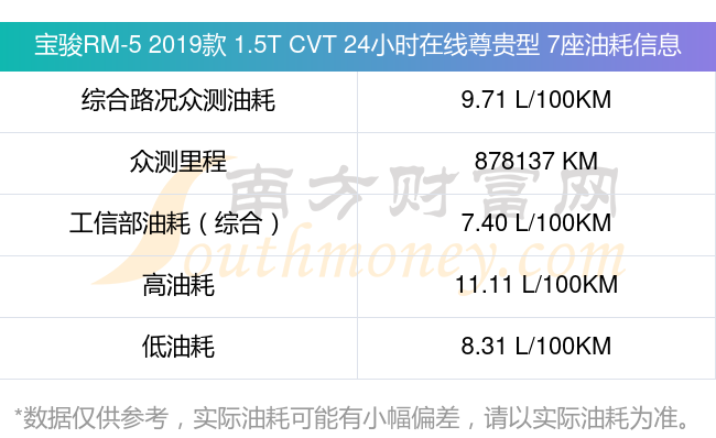 根据车主实测数据,该车型低油耗为8.31升/百公里,高油耗为11.11升/百公里,综合路况众测油耗为9.71升/百公里,工信部综合油耗为7.40升/百公里。