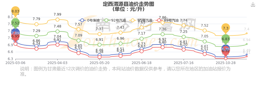 定西渭源县汽油、柴油11月14日每升的价格为:92号汽油6.94元;95号汽油7.4元;89号汽油6.41元;0号柴油6.49元,本次油价调整时间是11月11日。