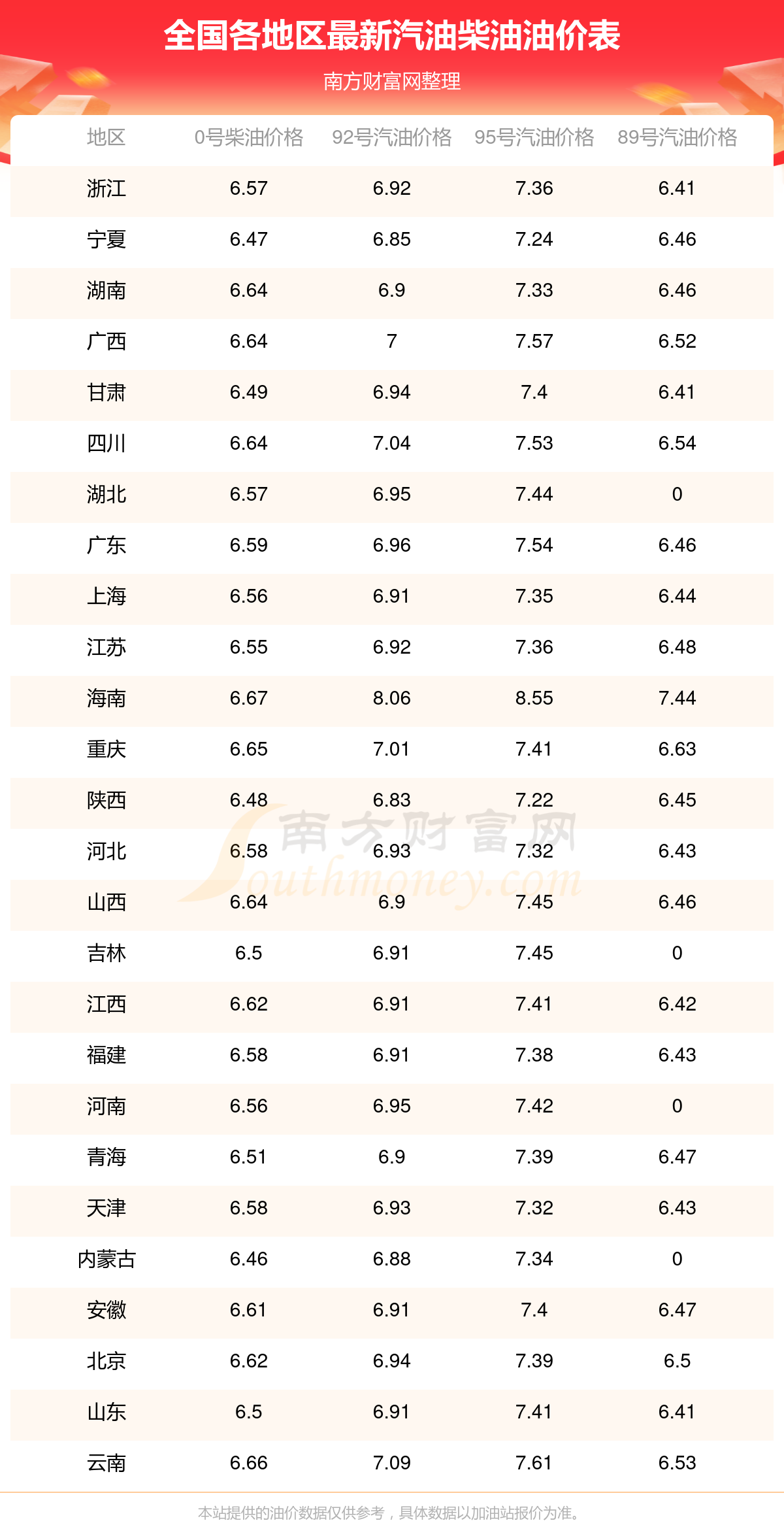全国95号汽油平均价格为:7元每升,其中,最低为陕西,价格7.22元/升,最高为海南,价格8.55元/升。