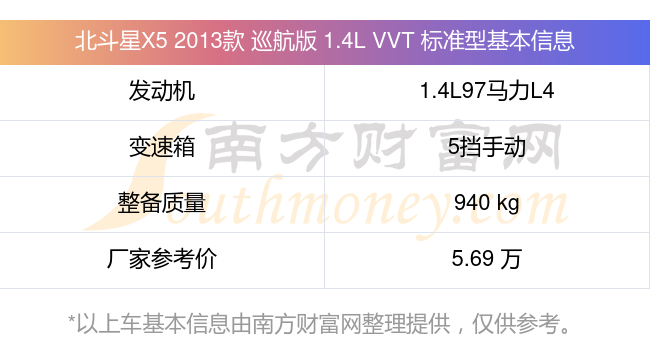 北斗星X5 2013款 巡航版 1.4L VVT 标准型动力方面,搭载的是一台1.4L97马力L4自然吸气发动机,匹配5挡手动挡变速箱,燃料形式为汽油,常规整备质量940kg,厂家参考价5.69万元。