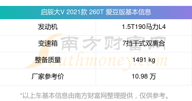 启辰大V 2021款 260T 爱豆版动力上搭载的是一台1.5T190马力L4涡轮增压发动机,匹配7挡干式双离合自动档变速箱,燃料形式为汽油,常规整备质量1491kg,厂家参考价10.98万元。