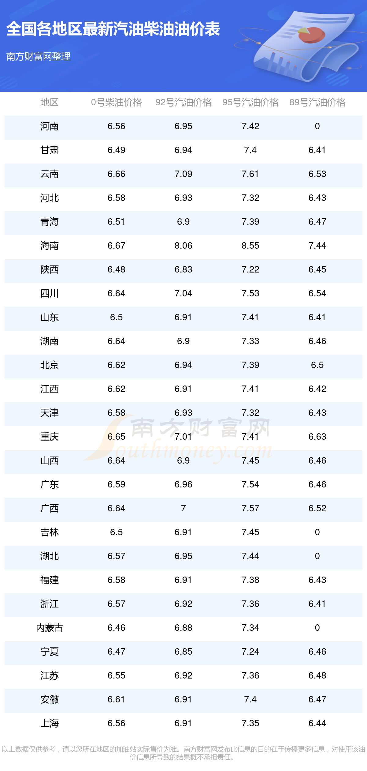11月14日全国0号柴油最新平均价格为7元每升(本轮油价格调整时间为11月11日),其中,全国0号柴油最低为内蒙古,价格6.46元/升,0号柴油最高为海南,价格6.67元/升。下一轮油价调整时间11月24日24时,距离现在还有10.61天。