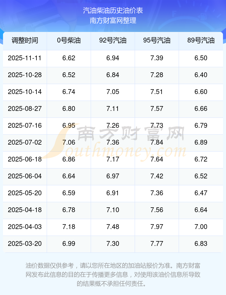 2025年汽油柴油油价调整一览表