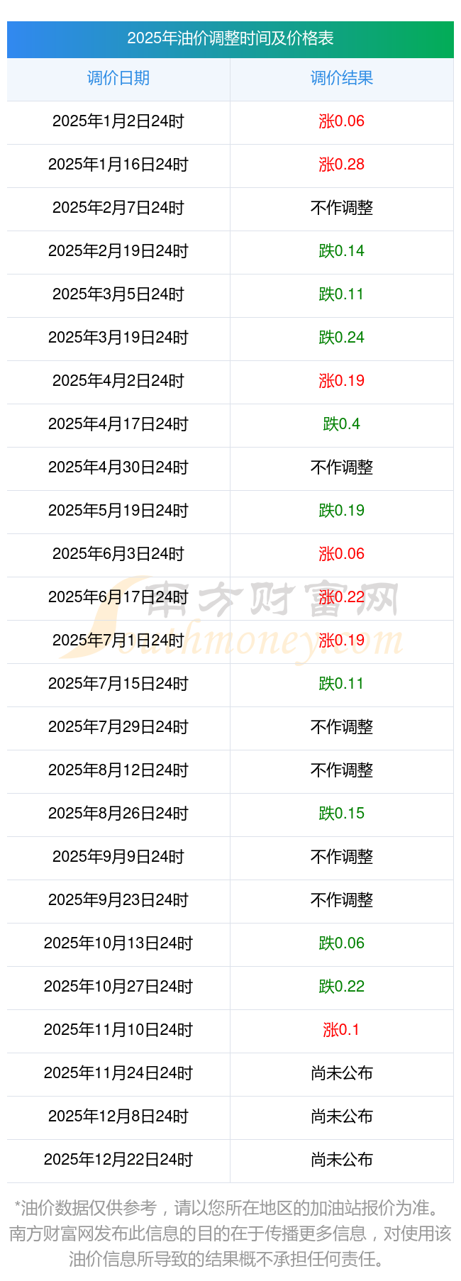 油价调整最新消息:下一轮油价调整时间11月24日24时。11月14日合肥瑶海区汽油、柴油价格是11月11日调整后的价格,每升价格具体为:92号汽油为6.91元,上调了0.1元,上调幅达1.47%;95号汽油为7.4元,上调了0.1元,上调幅达1.37%;89号汽油为6.47元,上调了0.1元,上调幅达1.57%;0号柴油为6.61元,上调了0.1元,上调幅达1.54%。
