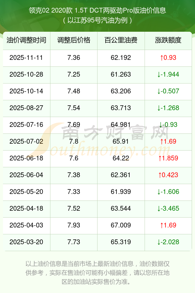 按11月11日95号汽油最新调整价格7.36元每升来计算(以江苏为例),该车型百公里平均油费为62.192元,按上一轮10月28日调整价格7.25元每升来计算,百公里平均油费为61.263元,对比上一轮多花0.93元,下一轮油价调整时间为11月24日24时。
