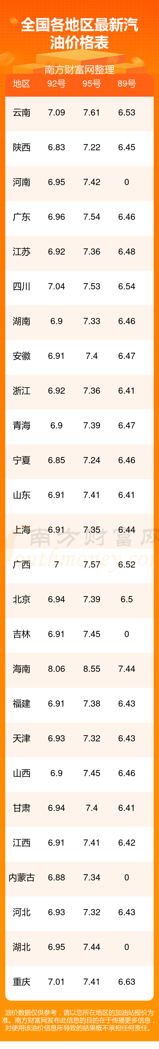 油价数据仅供参考,请以您所在地区的各加油站报价为准。