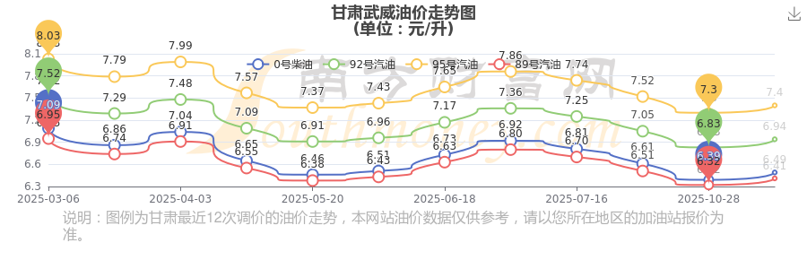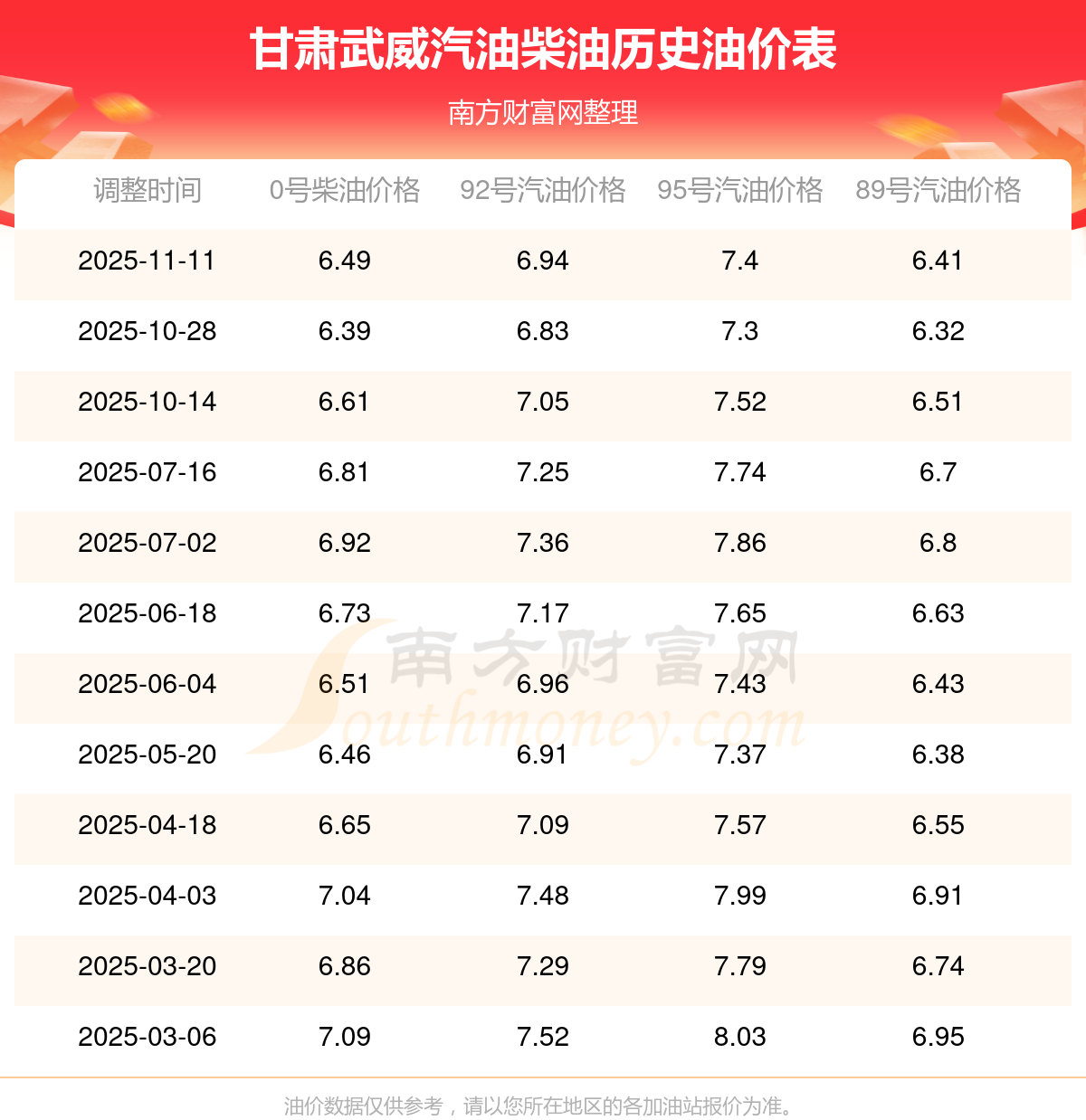 甘肃武威汽油、柴油11月14日每升最新价格:92号汽油为6.94元;95号汽油为7.4元;89号汽油为6.41元;0号柴油为6.49元,本轮油价调整时间为11月11日。