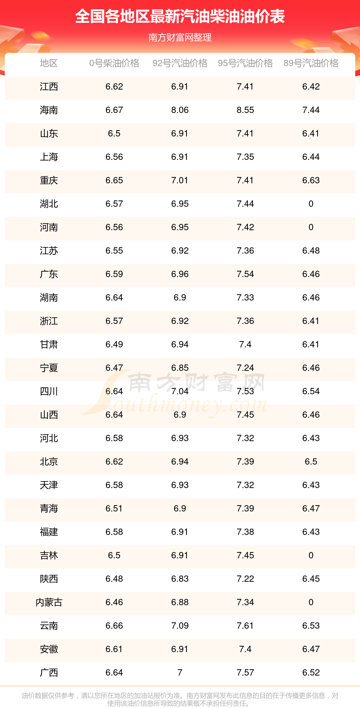 以上数据仅供参考,请以您所在地区的加油站实际售价为准。南方财富网发布此信息的目的在于传播更多信息,对使用该油价信息所导致的结果概不承担责任。