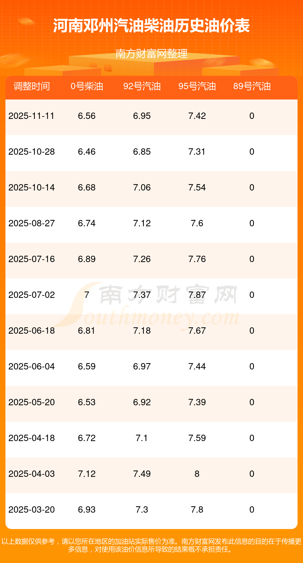 油价数据仅供参考,请以您所在地区的加油站报价为准。南方财富网发布此信息的目的在于传播更多信息,对使用该油价信息所导致的结果概不承担任何责任。