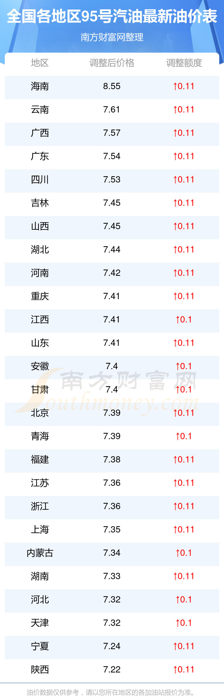 以上数据仅供参考,请以您所在地区的加油站实际售价为准。南方财富网发布此信息的目的在于传播更多信息,对使用该油价信息所导致的结果概不承担责任。