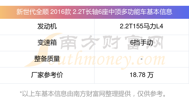在动力方面,新世代全顺 2016款 2.2T长轴6座中顶多功能车搭载的是一台2.2T155马力L4涡轮增压发动机,匹配6挡手动挡变速箱,燃料形式为柴油,厂家参考价18.78万元。
