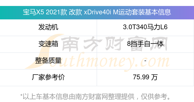 在动力上,宝马X5 2021款 改款 xDrive40i M运动套装配备的是一台3.0T340马力L6涡轮增压发动机,匹配的是8挡手自一体自动档变速箱,燃料形式为汽油,厂家参考价75.99万元。