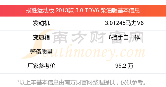 揽胜运动版 2013款 3.0 TDV6 柴油版动力方面,搭载的是一台3.0T245马力V6涡轮增压发动机,匹配6挡手自一体自动档变速箱,燃料形式为柴油,厂家参考价95.2万元。