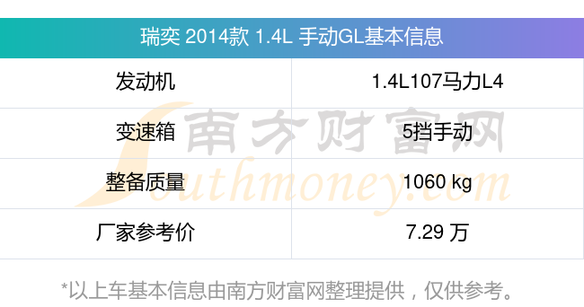 在动力上,瑞奕 2014款 1.4L 手动GL配备的是一台1.4L107马力L4自然吸气发动机,匹配的是5挡手动挡变速箱,燃料形式为汽油,常规整备质量1060kg,厂家参考价7.29万元。