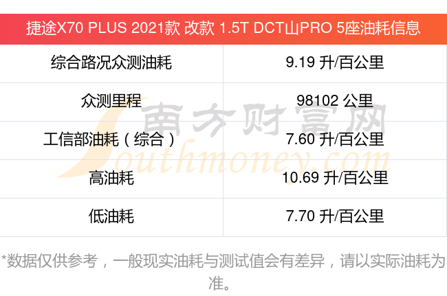 根据多位车主实测得出数据,该车型低油耗为7.70升/百公里,高油耗为10.69升/百公里,综合路况众测油耗为9.19升/百公里,工信部综合油耗为7.60升/百公里。