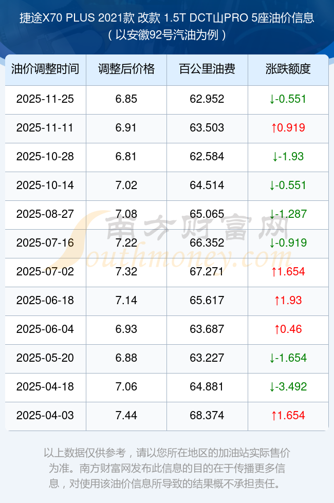 依照11月25日92号汽油最新调整价格6.85元/升来计算(以安徽为例),该车型百公里的平均油费是62.952元,依照上一轮11月11日调整价格6.91元/升来计算,百公里的平均油费是63.503元,对比上一轮少花0.551元,下一轮的油价调整时间12月8日24时。