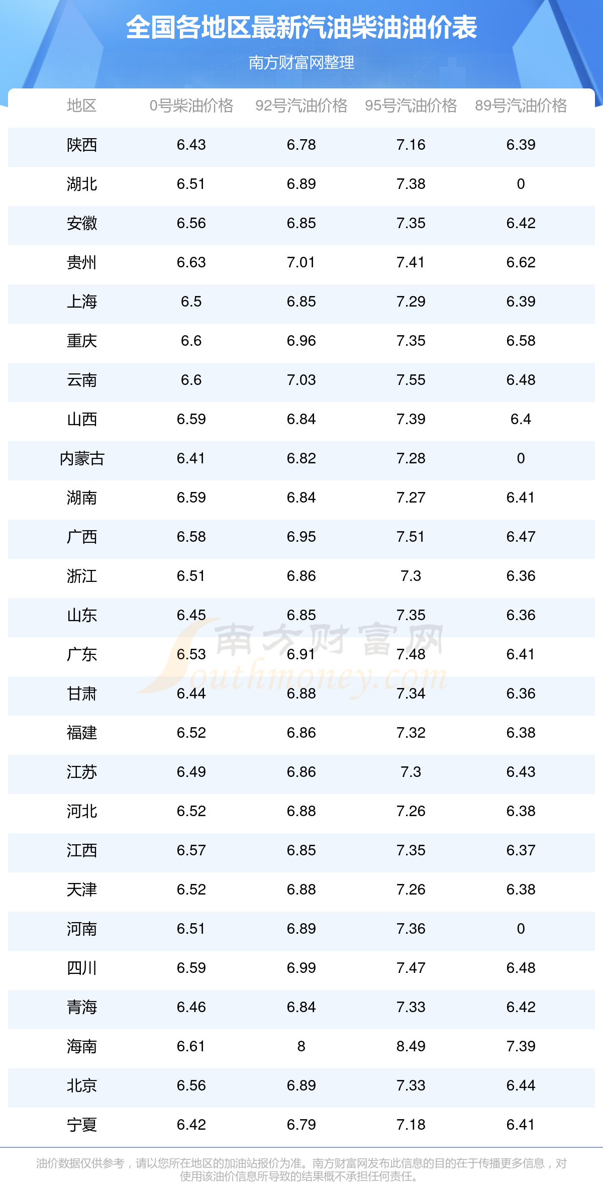 以上油价信息是当前市场上最新油价信息,油价数据仅供参考,实际在售油价可能有小幅偏差,请以您所在地区的加油站实际售价为准。