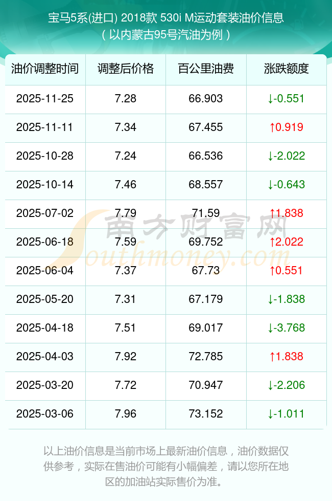 按照11月25日95号汽油最新调整价格7.28元/升来计算(以内蒙古为例),该车型百公里平均油费为66.903元,按照上一轮11月11日调整价格7.34元/升来计算,百公里平均油费为67.455元,对比上一轮少花0.551元,下一轮油价调整时间为12月8日24时。