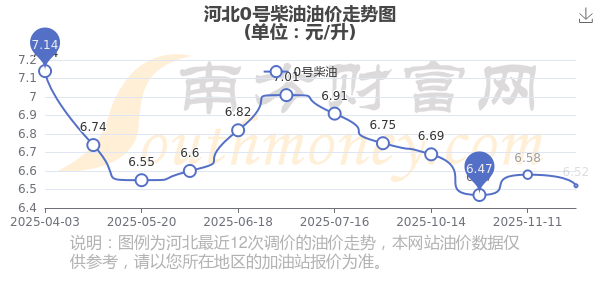 12月5日,河北0号柴油的价格是6.52元每升,本次的调整时间为11月25日,对比上次的调整下调了0.06元,下调0.912%,下次调整时间为12月8日24时,还有3.88天。