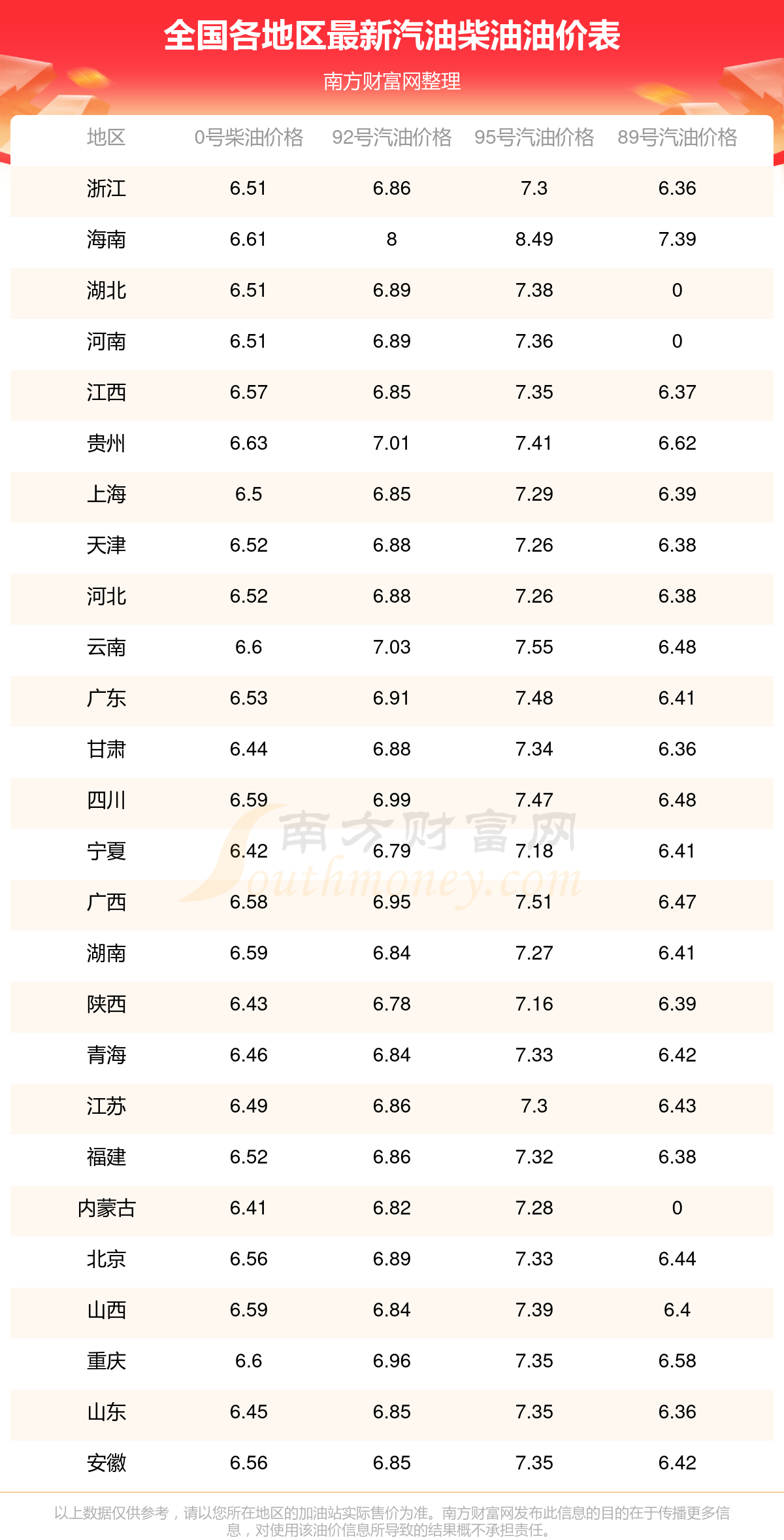 2025年12月5日全国各地汽油价格一览表