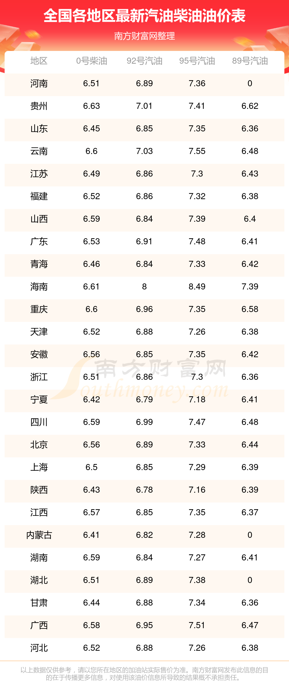 以上油价信息是当前市场上最新油价信息,油价数据仅供参考,实际在售油价可能有小幅偏差,请以您所在地区的加油站实际售价为准。