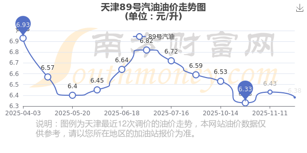 12月5日,天津89号汽油的价格是6.38元每升,本次的调整时间为11月25日,对比上次的调整跌了0.05元,跌0.778%,下次调整时间为12月8日24时,还有3.8天。