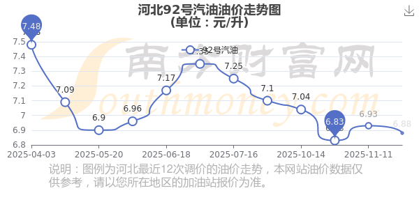 汽油价格调整最新消息:下一轮油价调整时间12月8日24时。12月5日河北汽油、柴油每升的价格具体为:本轮油价调整时间为11月25日,92号汽油是6.88元,下降了0.05元,下降幅达0.72%;95号汽油是7.26元,下降了0.06元,下降幅达0.82%;89号汽油为6.38元,下降了0.05元,下降幅达0.78%;0号柴油为6.52元,下降了0.06元,下降幅达0.91%。