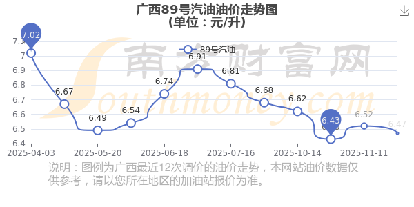 12月5日,广西89号汽油的价格是6.47元每升,本次的调整时间为11月25日,对比上次的调整下跌了0.05元,下跌0.767%,12月8日24时为下一轮油价调整时间,还有3.78天。