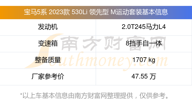 宝马5系 2023款 530Li 领先型 M运动套装动力上搭载的是一台2.0T245马力L4涡轮增压发动机,匹配8挡手自一体自动档变速箱,燃料形式为汽油,常规整备质量1707kg,厂家参考价47.55万元。