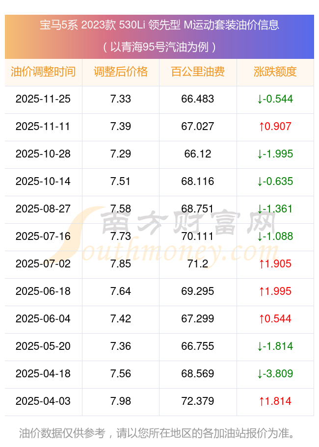 按11月25日95号汽油最新调整价格7.33元每升来计算(以青海为例),该车型百公里平均油费为66.483元,按上一轮11月11日调整价格7.39元每升来计算,百公里平均油费为67.027元,对比上一轮少花0.544元,下一轮油价调整时间为12月8日24时。