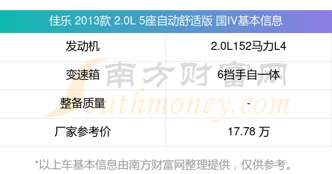 佳乐 2013款 2.0L 5座自动舒适版 国IV搭载了一台2.0L152马力L4自然吸气发动机,采用6挡手自一体自动档变速箱,厂家参考价17.78万元。