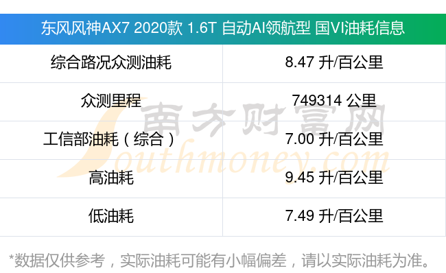 根据车主实测数据,该车型低油耗为7.49升/百公里,高油耗为9.45升/百公里,综合路况众测油耗为8.47升/百公里,工信部综合油耗为7.00升/百公里。