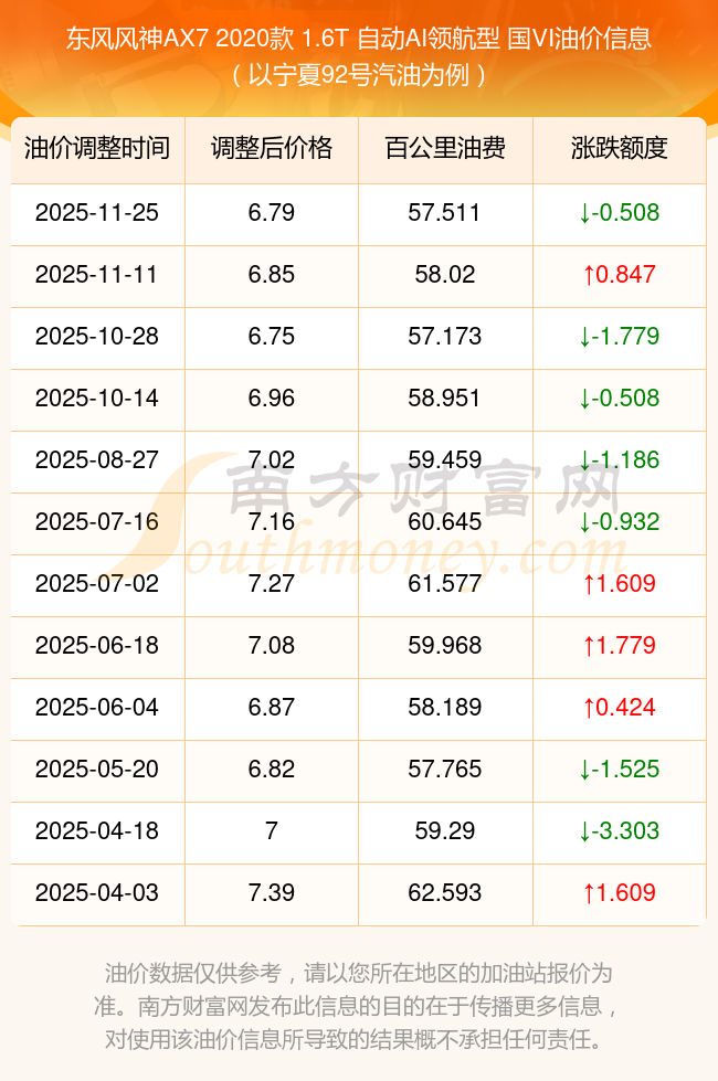 按照11月25日92号汽油最新调整价格6.79元/升来计算(以宁夏为例),该车型百公里平均油费为57.511元,按照上一轮11月11日调整价格6.85元/升来计算,百公里平均油费为58.02元,对比上一轮少花0.508元,下一轮油价调整时间为12月8日24时。