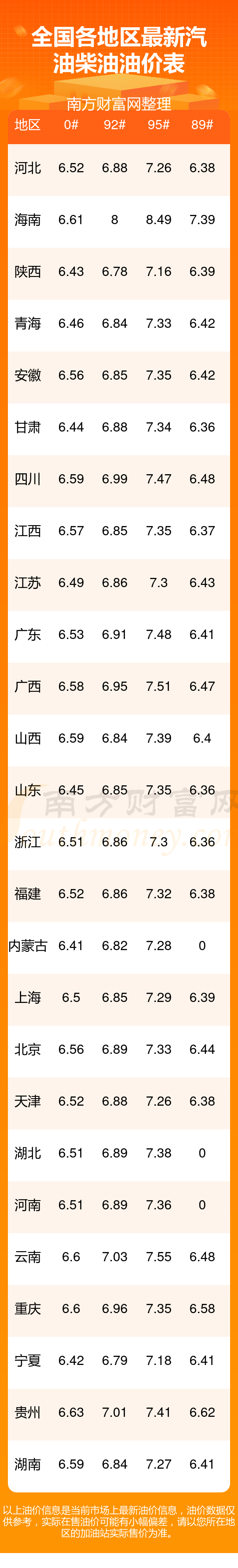 全国89号汽油最新平均价格为:6元每升,其中,最高为海南,价格为7.39元/升,最低为浙江,价格为6.36元/升。