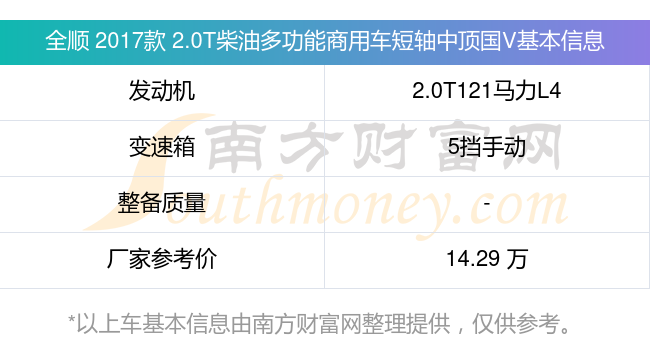 全顺 2017款 2.0T柴油多功能商用车短轴中顶国V搭载了一台2.0T121马力L4涡轮增压发动机,采用5挡手动挡变速箱,厂家参考价14.29万元。