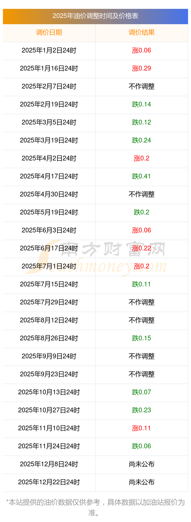油价调整最新消息:12月5日海南汽油、柴油的最新价格是11月25日调整后的价格,具体为92号汽油8元,下降了0.06元,下降幅达0.74%;95号汽油8.49元,下降了0.06元,下降幅达0.7%;89号汽油7.39元,下降了0.05元,下降幅达0.67%;0号柴油6.61元,下降了0.06元,下降幅达0.9%。下一轮油价调整时间12月8日24时。