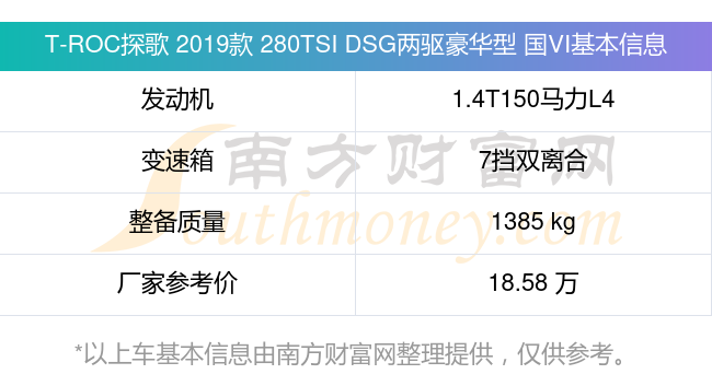 T-ROC探歌 2019款 280TSI DSG两驱豪华型 国VI动力上搭载的是一台1.4T150马力L4涡轮增压发动机,匹配7挡双离合自动档变速箱,燃料形式为汽油,常规整备质量1385kg,厂家参考价18.58万元。