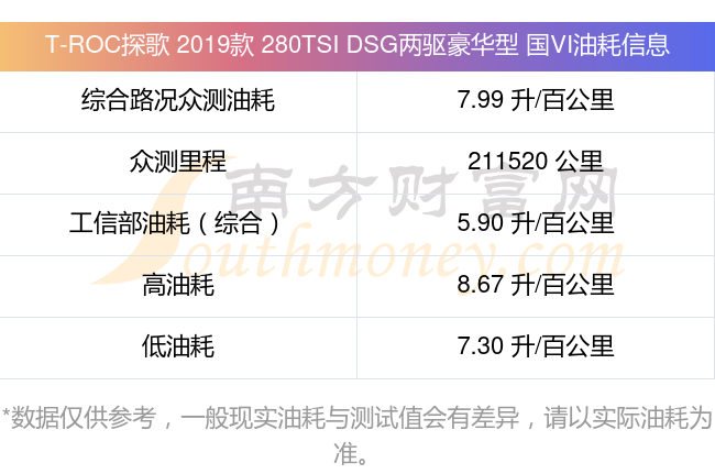 根据车主实测数据,该车型低油耗为7.30升/百公里,高油耗为8.67升/百公里,综合路况众测油耗为7.99升/百公里,工信部综合油耗为5.90升/百公里。