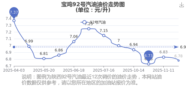油价调整最新消息:12月5日宝鸡汽油、柴油每升的价格是11月25日调整后的价格:92号汽油为6.78元,下降了0.05元,下降幅达0.73%;95号汽油为7.16元,下降了0.06元,下降幅达0.83%;89号汽油为6.39元,下降了0.06元,下降幅达0.93%;0号柴油为6.43元,下降了0.05元,下降幅达0.77%。宝鸡下一轮油价调整时间12月8日24时,距离现在还有3.73天。