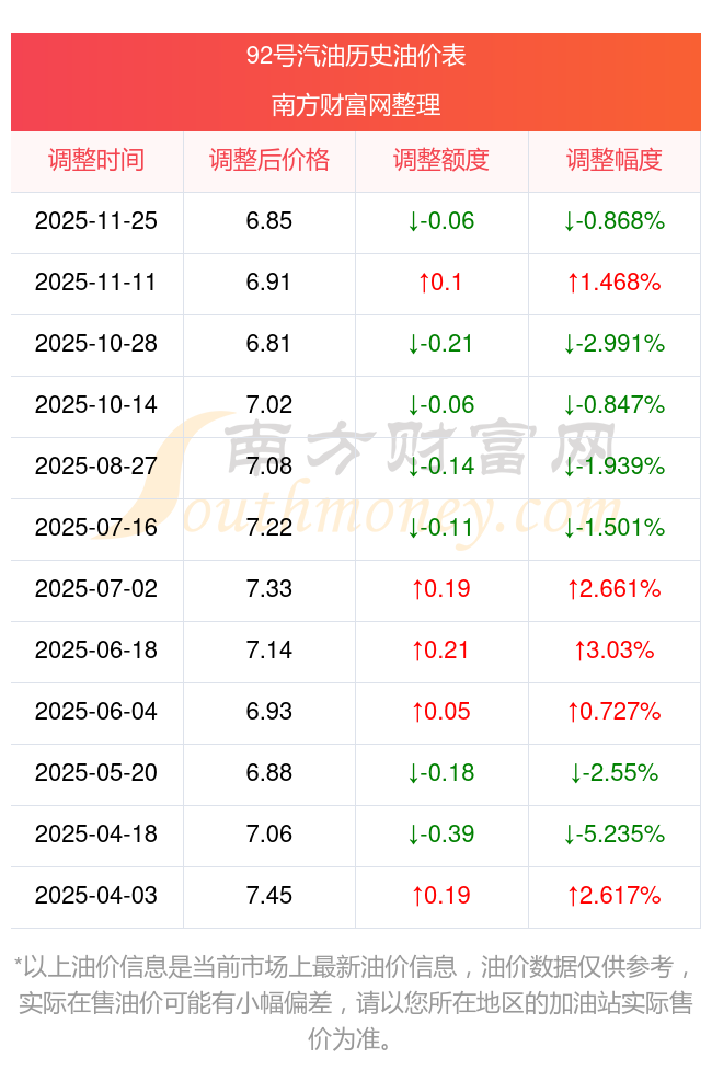 以上数据仅供参考,请以您所在地区的加油站实际售价为准。南方财富网发布此信息的目的在于传播更多信息,对使用该油价信息所导致的结果概不承担责任。