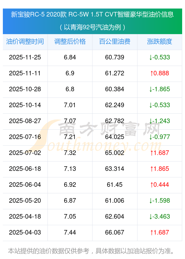 按照11月25日92号汽油最新调整价格6.84元/升来计算(以青海为例),该车型百公里平均油费为60.739元,按照上一轮11月11日调整价格6.9元/升来计算,百公里平均油费为61.272元,对比上一轮少花0.533元,下一轮油价调整时间为12月8日24时。