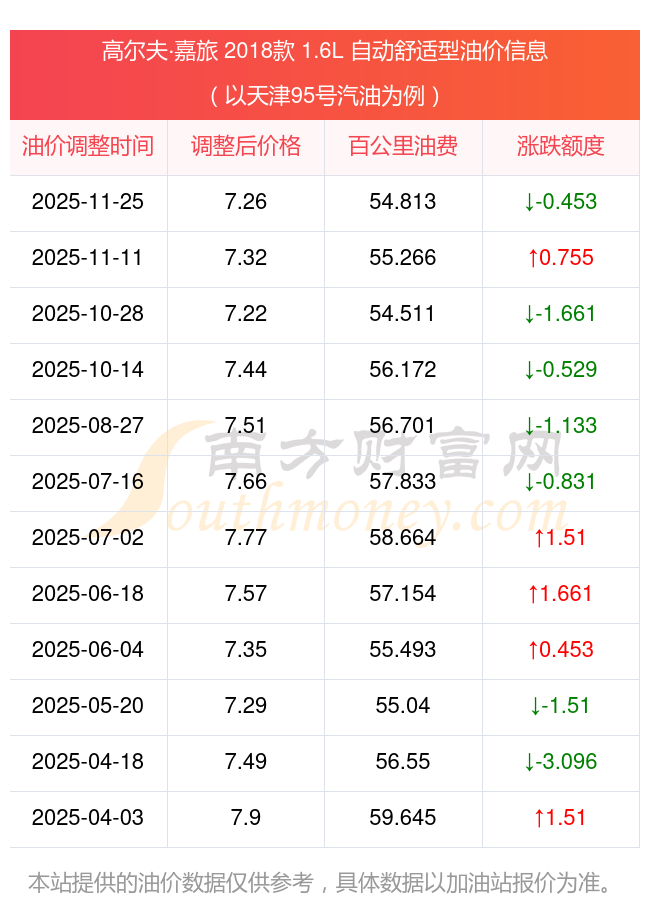 按11月25日95号汽油最新调整价格7.26元每升来计算(以天津为例),该车型百公里平均油费为54.813元,按上一轮11月11日调整价格7.32元每升来计算,百公里平均油费为55.266元,对比上一轮少花0.453元,下一轮油价调整时间为12月8日24时。