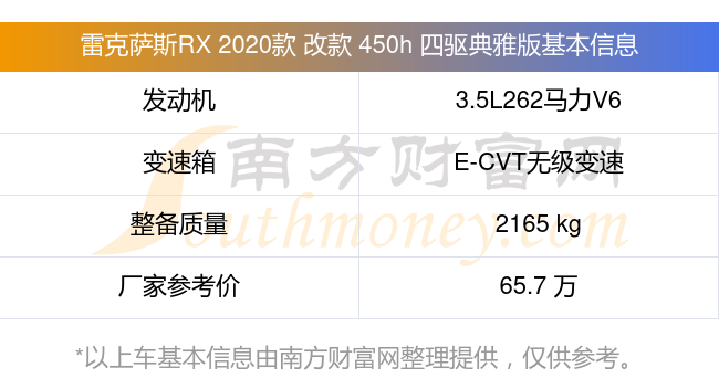 雷克萨斯RX 2020款 改款 450h 四驱典雅版搭载了一台3.5L262马力V6自然吸气发动机,采用E-CVT无级变速自动档变速箱,常规整备质量2165kg,厂家参考价65.7万元。