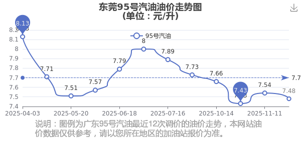 东莞汽油、柴油12月6日每升的价格是多少?具体为:92号汽油为6.91元,下跌了0.05元;95号汽油为7.48元,下跌了0.06元;89号汽油为6.41元,下跌了0.05元;0号柴油为6.53元,下跌了0.06元,本轮油价的调整时间为11月25日。下一轮油价调整时间12月8日24时,距离现在还有2.22天。
