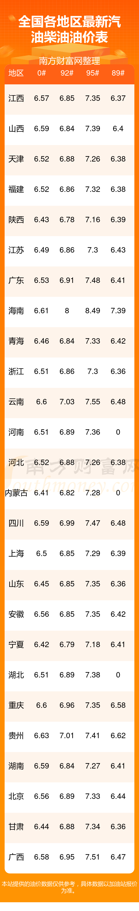 以上油价信息是当前市场上最新油价信息,油价数据仅供参考,实际在售油价可能有小幅偏差,请以您所在地区的加油站实际售价为准。