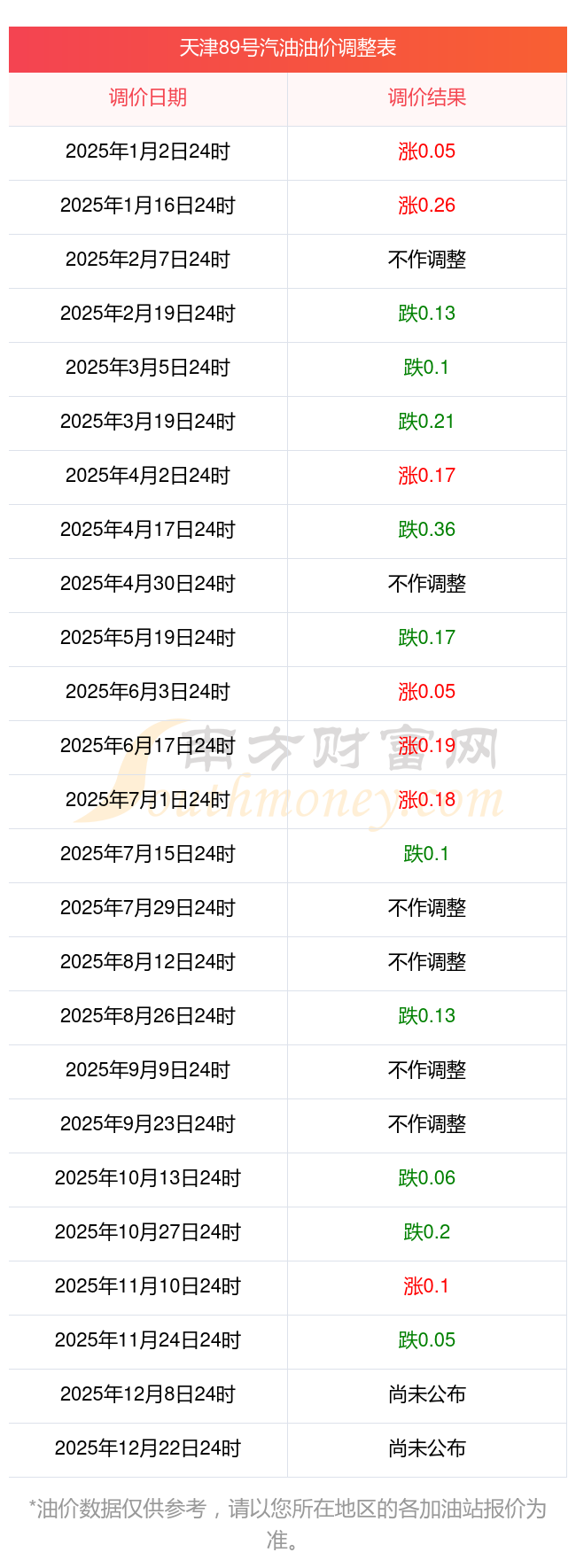 12月6日,天津89号汽油的价格是6.38元每升,本次的调整时间为11月25日,对比上次的调整下跌了0.05元,下跌0.778%,下次调整时间为12月8日24时,还有2.22天。