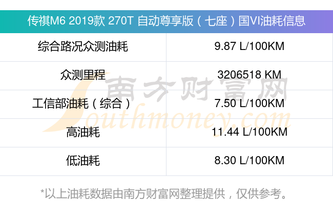 传祺M6 2019款 270T 自动尊享版(七座)国VI动力上配备的是一台1.5T169马力L4涡轮增压发动机,匹配的是7挡双离合自动档变速箱,燃料形式为汽油,常规整备质量1690kg,厂家参考价13.98万元。