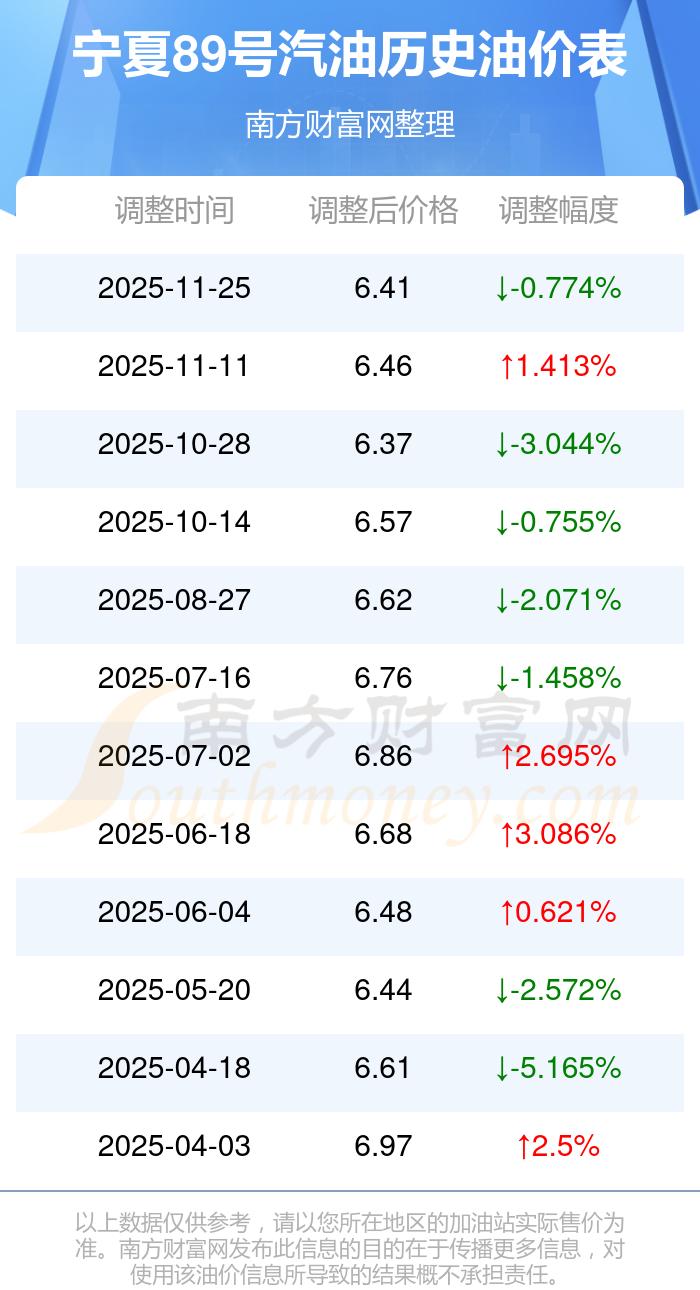 12月6日,宁夏89号汽油的价格是6.41元每升,本次的调整时间为11月25日,对比上次的调整跌了0.05元,跌0.774%,12月8日24时为下一轮油价调整时间,还有2.21天。