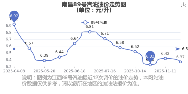 南昌汽油、柴油12月6日每升的价格为11月25日调整后的价格,具体油价为:92号汽油6.85元;95号汽油7.35元;89号汽油6.37元;0号柴油6.57元。下一轮油价调整时间12月8日24时,距离现在还有2.21天。