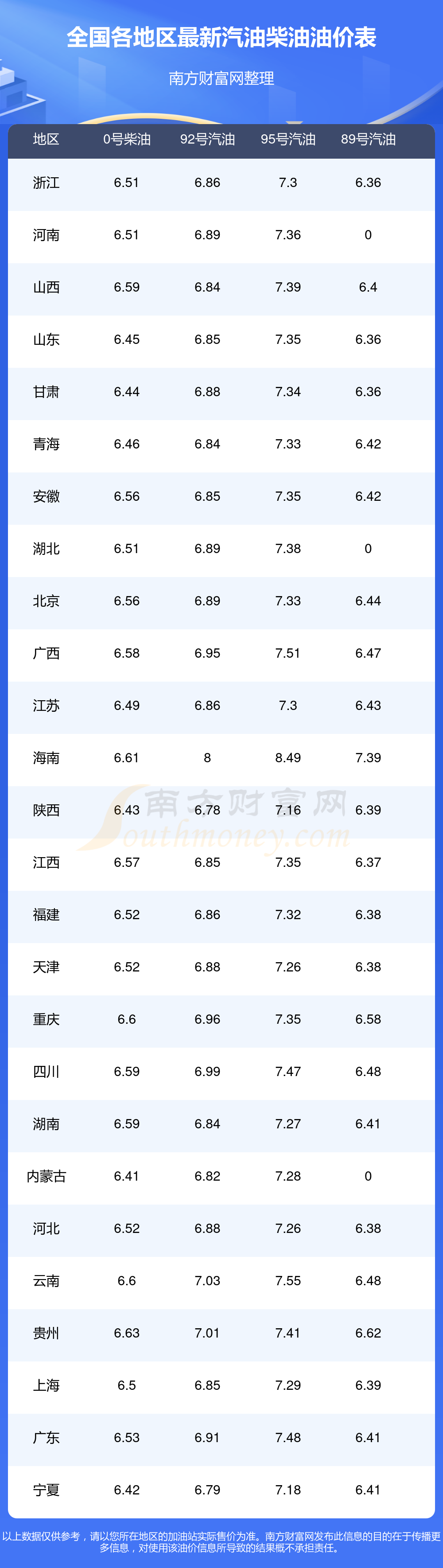 12月6日,全国89号汽油最新平均价格为6元每升(根据11月25日油价调整后计算),其中全国89号汽油最低为浙江,价格6.36元/升,89号汽油最高为海南,价格7.39元/升。,下一轮油价调整时间12月8日24时,距离现在还有2.21天。
